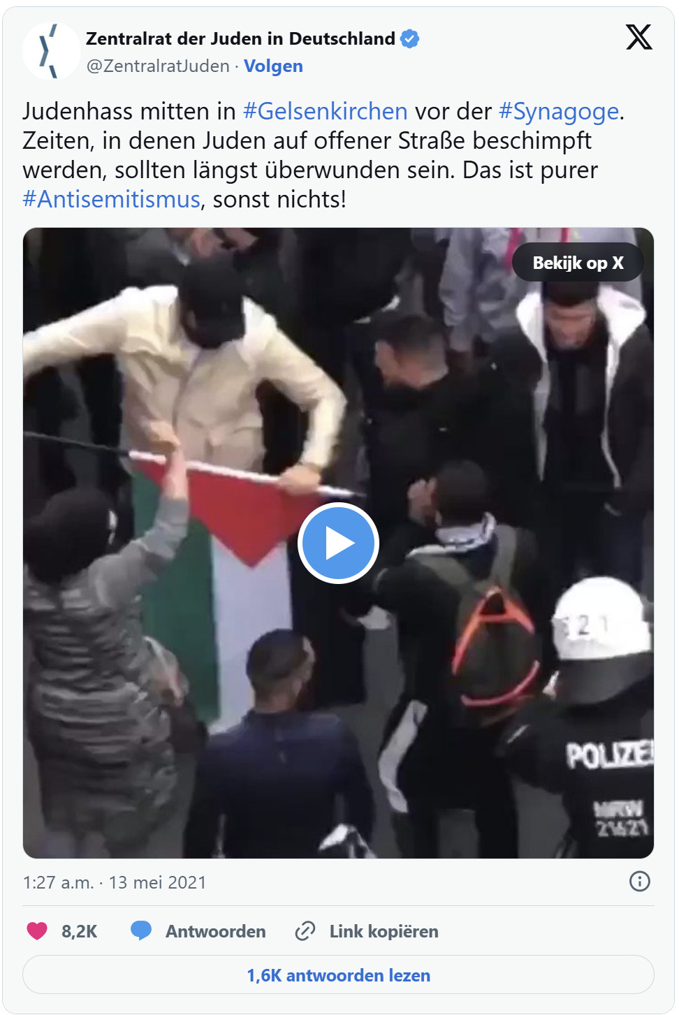 We hebben inmiddels bijna een miljoen islamieten in Nederland, en het is een grof schandaal dat velen van hen afgelopen week de straat opgingen en leuzen riepen als: ‘Khaybar Khaybar, ya yahud, Jaish Muhammad, sa ya’ud.’ Een argeloze voorbijganger zal het misschien niet opmerken, maar deze leus verheerlijkt de uitroeiing van een Joodse stam door Mohammed. Overal te wereld ‘demonstreren’ dergelijke meutes en schreeuwen tegen ‘de Joden’. Het was afschuwelijk om zo’n meute te horen voor de synagoge in Gelsenkirchen. ‘Scheiß Juden! Scheiß Juden!’ De hedendaagse nazi’s. Maar als Joden hierom vluchten naar Israël, zijn ze kolonisten.